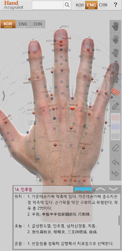 - Aplikasi ini mengandungi 21 acupoints di bahagian belakang Tangan dan 21 acupoints lagi di bahagian Hand palm, dan setiap acupoints ditulis dalam teks Korea, Inggeris dan Cina dari segi lokasi, keberkesanan dan kaedah operasi.