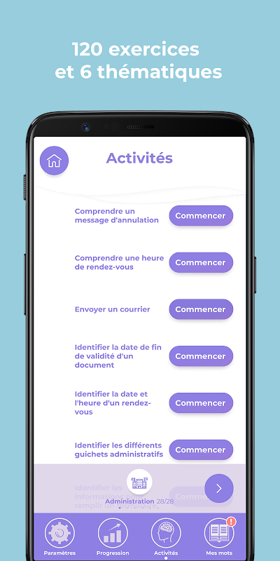 Permohonan ini mengandungi: 120 latihan dan 100 perkataan untuk ditemui dibahagikan kepada 6 tema: Pengangkutan; alam sekitar; Kesihatan; Pembelian; Perumahan.