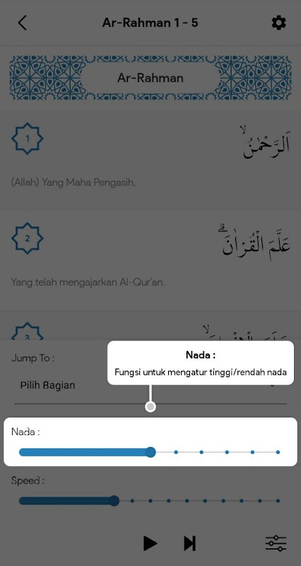 1. Satu satunya aplikasi yang bisa mengulang-ulang bukan hanya per ayat tetapi per POTONGAN ayat. hal ini membuat siapapun yang mendengar potongan kecil yang diulang-ulang, akan hafal dengan sendirinya. kalau pengulangannya per ayat masih berat jika ayatnya cukup panjang.