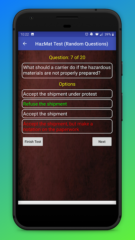 Aplikasi HazMat Test ialah apl percuma untuk menyediakan diri anda untuk ujian hazmat CDL. Untuk memandu kenderaan yang mengandungi bahan berbahaya, adalah perlu untuk mempunyai "H Endorsement" (Pengendorsan bahan berbahaya) dengan lesen memandu komersial (CDL). Aplikasi ini mengandungi soalan daripada peperiksaan hazmat sebenar yang diadakan pada 2017, 2018, 2019, 2020, 2021, dan 2022.
