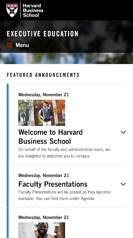 Aplikasi mudah alih HBS ExEd menyediakan akses kepada pengumuman, agenda, dan banyak lagi.