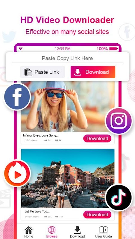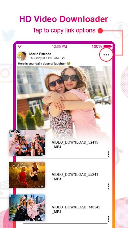 Pemuat turun Video Sosial - Pengunduh HD dengan mudah memuat turun video dari internet dan laman sosial pada peranti anda. Aplikasi Pemuat Video Percuma menyokong semua format. Ia hanya perlu menyalin pautan video kegemaran anda dan menampal pautan untuk memuat turun dengan satu ketukan. Pemuat turun HD adalah pemuat turun super cepat yang kuat yang dapat menjeda dan menyambung semula muat turun dengan mudah, memuat turun banyak fail pada masa yang sama. Pemuat turun video turbo percuma adalah penyelesaian terbaik untuk memuat turun xvideos berkualiti tinggi. Gunakan pemuat turun video sosial untuk melihat video terlebih dahulu, salin dan tampal pautan, muat turun dan mainkan di luar talian.