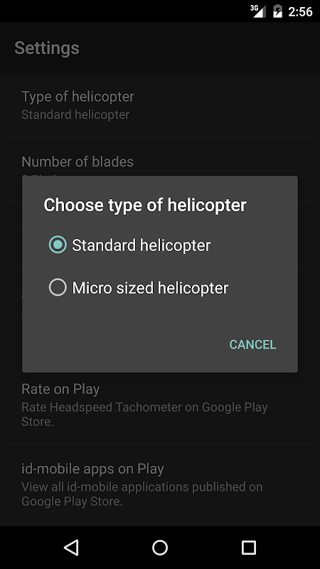 Menggunakan Tetapan anda boleh memilih antara standard (rpm sehingga 4000) dan mikro bersaiz (rpm sehingga 8000) dan helikopter setup bilangan bilah antara 2 dan 5.