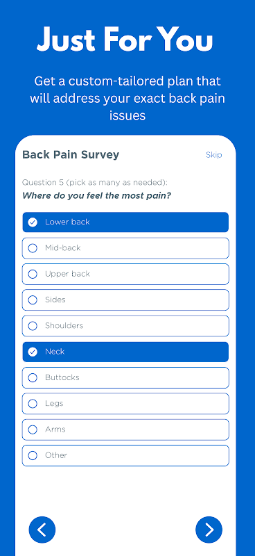 Sama ada anda mengalami ketidakselesaan ringan, serangan berulang atau sakit kronik yang berpanjangan, apl ini menyesuaikan diri dengan keperluan anda dengan pengesyoran yang diperibadikan dan pelarasan berasaskan kemajuan.