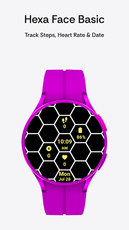 Muka jam tangan heksagon yang bersih dan bergaya direka untuk kegunaan harian pada jam tangan pintar Wear OS.
