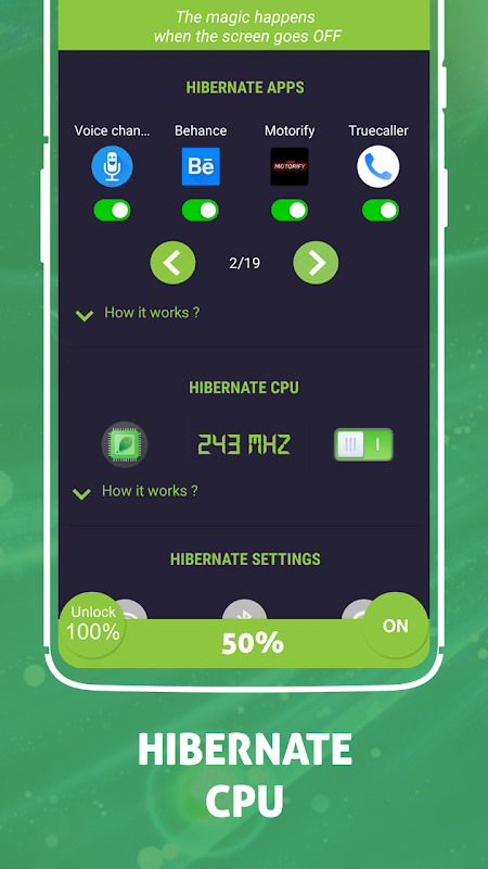 Hibernate boost up your device's battery health in a powerful & unique way. Unlike other battery saver and battery charger apps it does not interfere in your daily usage of your smartphone or tablet. Once you had opened Hibernate app and set it up to increase your device's battery life, you can practically forget about it. One of the best thing of Hibernate is that it only works when your phone in sleep mode.