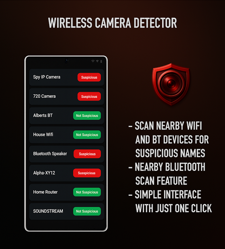 Pengesan Kamera Tersembunyi AI mengesan kamera tersembunyi melalui pengimbasan wayarles (Wi-Fi dan Bluetooth), pengesanan berasaskan magnetometer untuk kamera berwayar dan pengesanan kamera inframerah menggunakan penapis khusus.