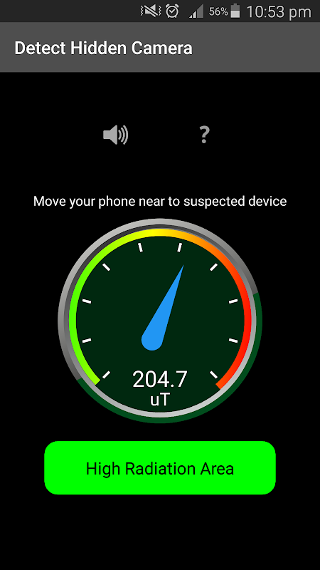 Open hidden camera detector - anti spy cam and Press the "Detect Using Magnetic Sensor" button to start detecting. You just need to move your device/phone around the suspected area. If the magnetic field values rise then there is a chance that there is a spying hidden camera or hidden microphone in that area. The hidden camera detector - anti spy cam will beep if it detects any spying device nearby. You can turn the beep on or off by tapping the speaker button on top.