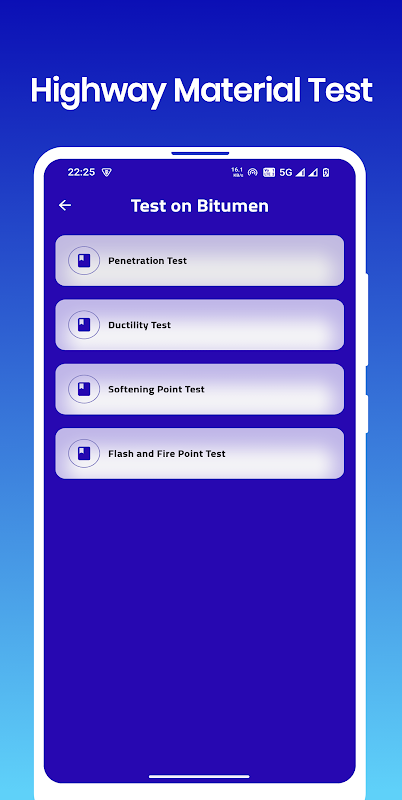 Aplikasi ini sangat berguna bagi jurutera lebuh raya untuk mengetahui bahan yang digunakan dalam lebuh raya dan ujian. Aplikasi ini merangkumi ujian kategori tepat seperti ujian di tanah, ujian di simen, ujian di Bitumen dan banyak lagi. Apabila anda membuka subkategori, anda akan mendapat ujian berkaitan dengan bahan yang dihormati.