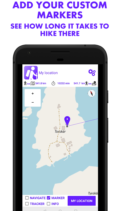 🧭 Marker Custom marker which you can place anywhere in the map. The screen tells you how long it takes to walk to the marker and how far it is from your current location. You can use "Navigate" together with this