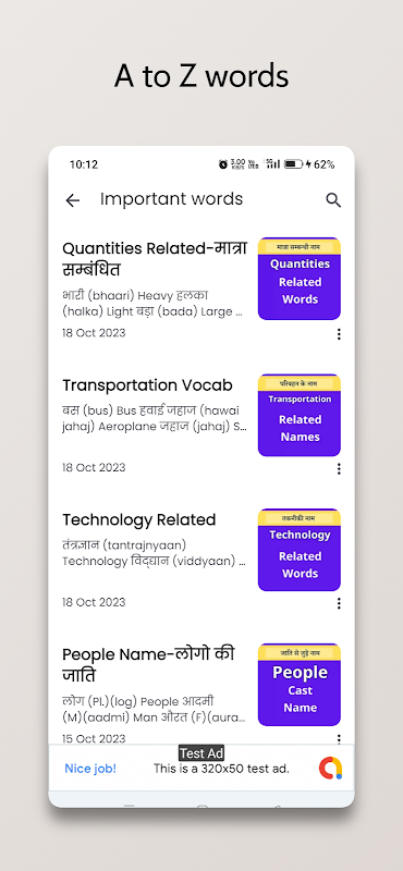 Aplikasi ini boleh membantu dalam pembelajaran bahasa Hindi dan Inggeris. Perkataan disediakan dengan penggunaan tatabahasa yang betul seperti penggunaan harian perbendaharaan kata bahasa Inggeris untuk sekolah rumah pejabat, kolej dan lain-lain. Banyak simpulan bahasa dijelaskan melalui contoh. Perkataan yang sukar dijelaskan dengan contoh dan definisi terperinci. Pembelajaran perkataan harian membantu dalam membina perbendaharaan kata untuk bahasa. Sinonim perkataan membantu dalam mengetahui perkataan yang serupa dan antonim perkataan membantu dalam mengetahui makna yang bertentangan.