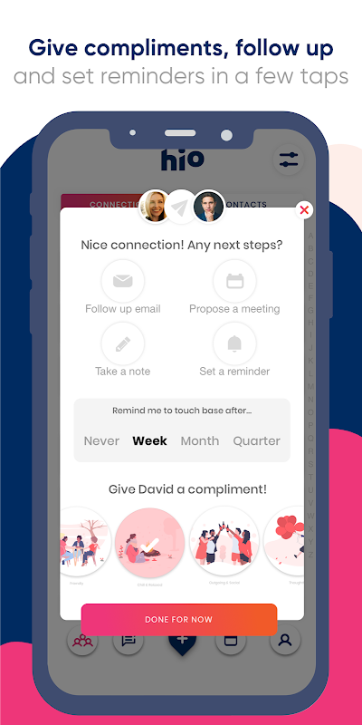 - Note-taking on all of your Hio contacts, helping you remember key details