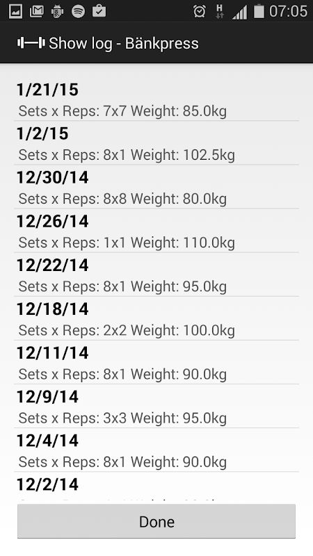 Aplikasi ini menjejak anda latihan (set, wakil, berat) dan log kemajuan anda. Anda boleh membuat lebih daripada satu kes profile.in anda ingin menggunakan program ini untuk lebih latihan daripada akhbar bangku.