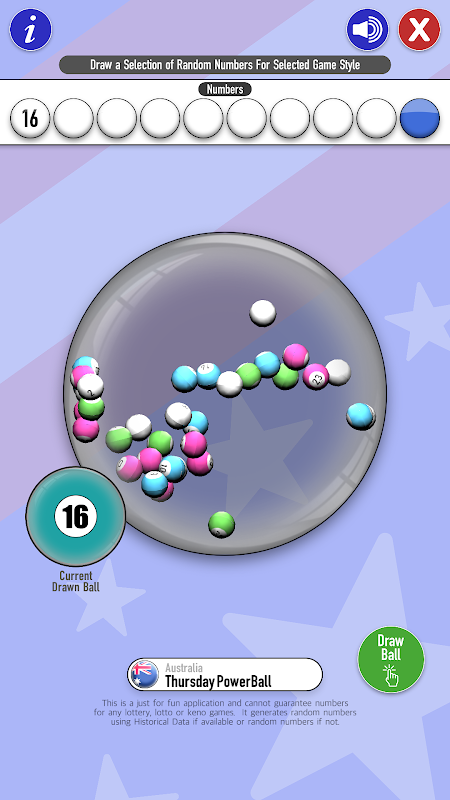 Ini adalah aplikasi hanya untuk keseronokan dan tidak dapat menjamin nombor untuk mana-mana permainan Lotto, Loteri, Keno atau Bingo.
