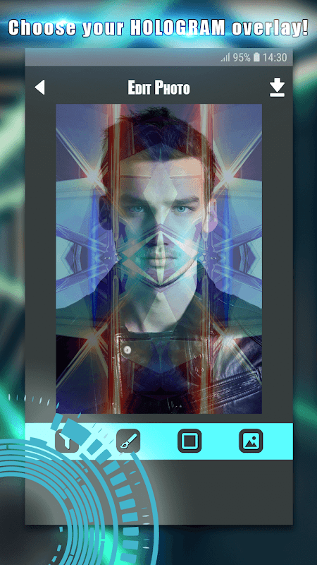 Create your own dystopia or utopia in Hologram Photo Maker! Add hologram effects to photos, various image effects and complete a cool photo montage! Draw and write text on your technology photo! Express creativity and produce art inspired by science and technology and parallel universes! Explore all the awesome options of this hologram projector photo app. You can look like a robo enemy or a villain easily with a VR camera hologram filter! Pretend that you are solving computer problems or fighting crime with this AR camera app!