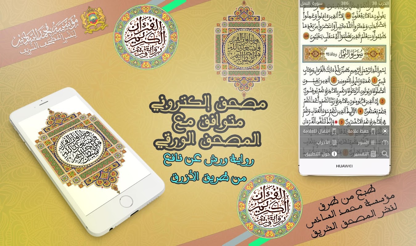 Al-Qur'an lengkap dengan periwayatan Warsh dengan tafsiran. Ini adalah Al-Qur'an Mulia, salinan Al-Quran Muhamad yang Mulia. Al-Qur'an mulia ini ditulis mengikut riwayat Warsh di Nafe, lengkap tanpa sambungan internet dan dicirikan oleh yang berikut:
