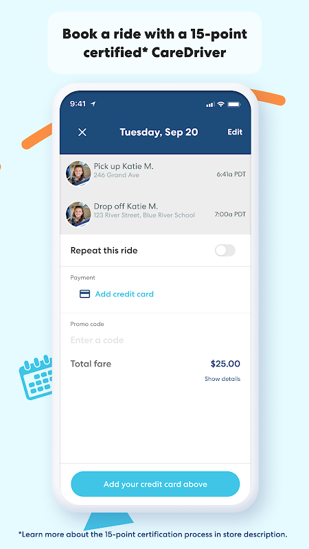 Anda akan mendapat maklumat tentang CareDriver anak anda lebih awal: foto, bio dan butiran kenderaan. Ini membantu anda mengetahui dengan tepat siapa yang memberi anak anda tumpangan dan menyediakan anak anda untuk perjalanan mereka yang akan datang.