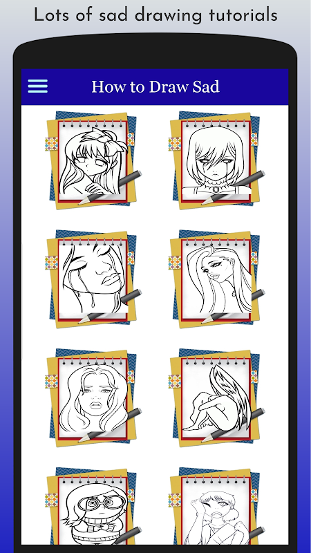 Adakah anda ingin belajar melukis ekspresi sedih? Di sini adalah tempat untuk melukis sesuatu. Tutorial lukisan sedih ini boleh menjadi teman terbaik anda untuk mengembangkan keupayaan lukisan anda. Melalui aplikasi ini, anda boleh belajar cara melukis sesuatu yang mudah sendiri atau anda juga boleh belajar melukis bersama rakan. Tutorial lukisan percuma ini menyediakan banyak pelajaran lukisan untuk anda. Anda boleh belajar cara melukis orang dengan ekspresi sedih.