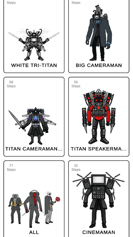 Cara melukis tandas skibidi apl langkah demi langkah mengandungi pelajaran terperinci tentang cara melukis watak kartun tandas skibidi yang popular seperti BIG SPEAKERMAN, TITAN CAMERAMAN, TITAN SPEAKERMAN, TITAN TV MAN, TV MAN. Dengan arahan mudah dan ilustrasi yang jelas, anda akan mempelajari dengan cepat teknik yang anda perlukan untuk mencipta ilustrasi watak anda yang menakjubkan.