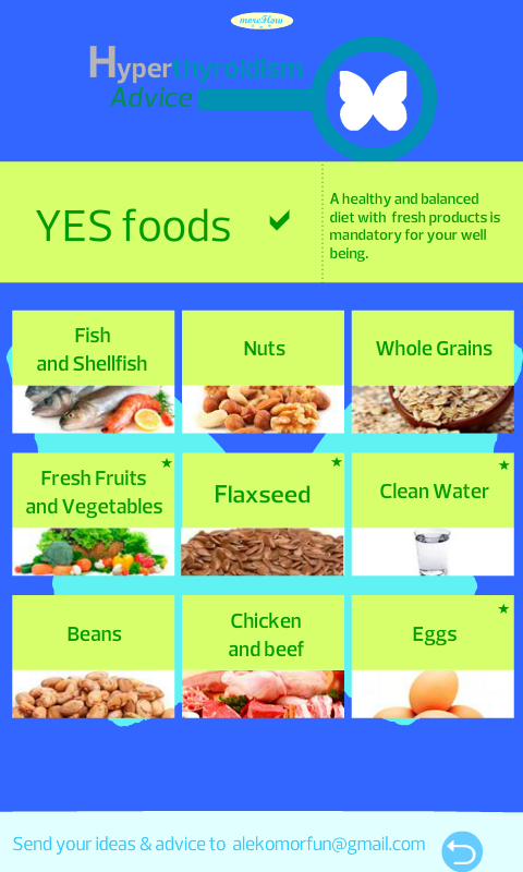 In Hyperthyroidism Advice you can find simple guidelines to treat your Hyperthyroidism. What to eat, workouts and lifestyle changes to improve your well-being. Hyperthyroidism Advice is simple and easy to use. A good reminder for all Hyperthyroidism patients. Hyperthyroidism can be better controlled with some changes in your lifestyle. Some people even heal their hyperthyroid doing changes in their lifestyle and diet.