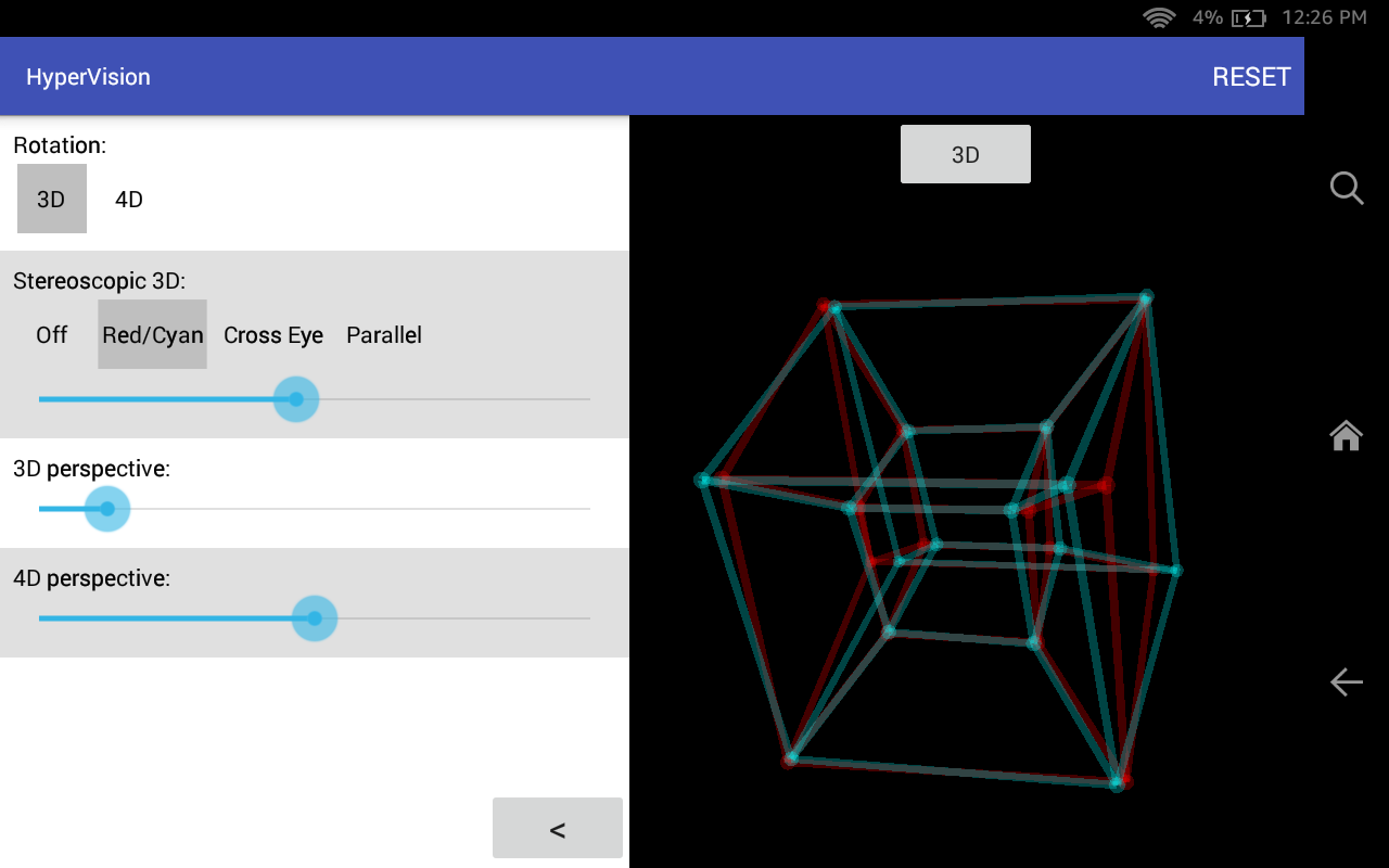 Di HyperVision, anda boleh memutarkan hypercube dalam 3 dimensi dan 4 dimensi. Anda juga dapat melihatnya dalam 3D dengan menggunakan kacamata 3D atau dengan pandangan silang.