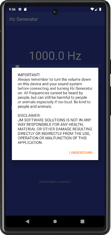 Sentiasa ingat untuk mengecilkan kelantangan pada sistem bunyi anda sebelum menyambung dan menghidupkan apl ini. Semua frekuensi tidak boleh dimainkan pada semua peranti/sistem audio. Semua frekuensi tidak boleh didengar, tetapi boleh memudaratkan jika terlalu kuat. Berbuat baik kepada haiwan dan manusia.