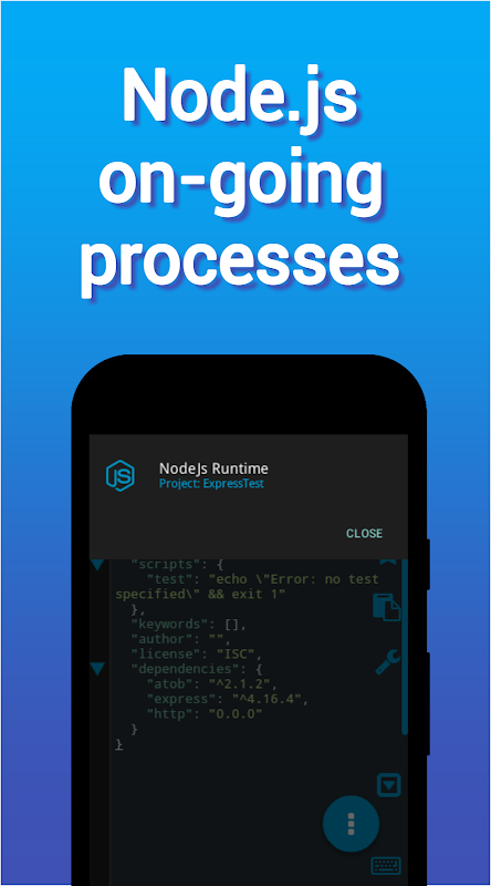 • NodeJs projects keep everything clean and easy to manage. Run a project with a tap of a finger.