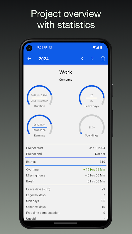 - Gambaran keseluruhan hari cuti, cuti, lebih masa, waktu bekerja anda (harian, mingguan, bulanan atau tahunan)