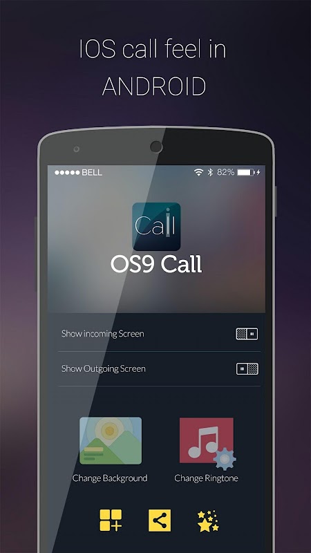 Want new calling screen themes? Bored with old call screens? Do you like OS9 UI of calling screens? Then switch to the latest Call Screen with OS9 phone 6S themes. You can customize the Calling screens the way you want. You can place different background or even use your photo as background of the calling screen. You can either set both incoming and outgoing calling screen or select any one of it. You can select default background given within the application or set your own photo as background of the calling screen.