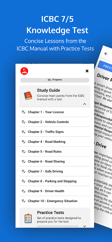 Bersedia untuk ujian pengetahuan ICBC? Aplikasi ini membantu pelajar British Columbia mempelajari peraturan jalan raya, menyemak papan tanda lalu lintas dan berlatih dengan soalan kuiz yang realistik — direka untuk menyokong pembelajaran anda bersama bahan rasmi.