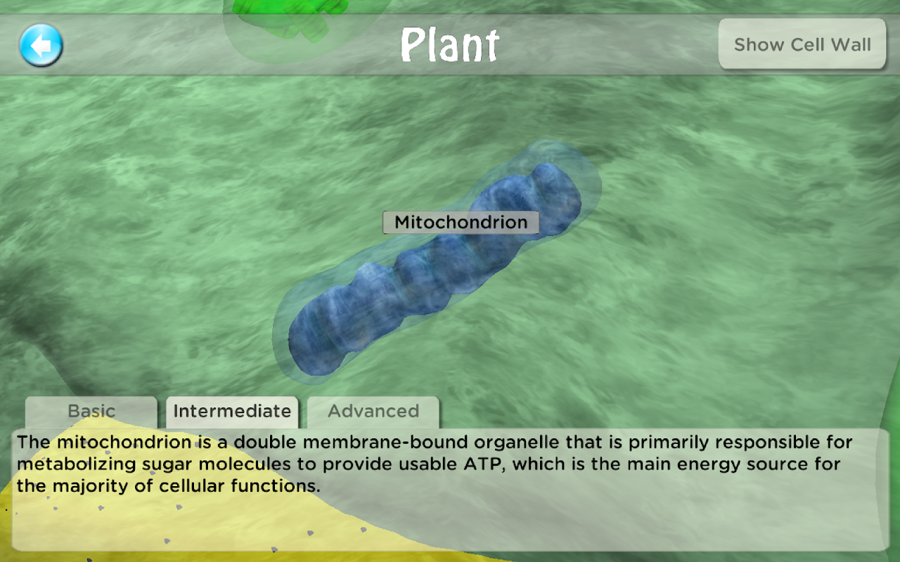 Anda boleh menggunakan jari anda untuk memanfaatkan bahagian-bahagian sel untuk memilih dan mengezum masuk pada organel tertentu. Setiap organel dilengkapi dengan nama dan penerangan ringkas fungsinya dalam sel.
