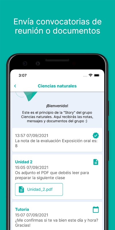 Melalui "cerita", keluarga dan pelajar menerima semua jenis maklumat daripada guru dan pusat pendidikan dengan semua berita dalam masa nyata. Mereka boleh dihantar dari pesanan teks ke nota pelajar anda, laporan kehadiran, kejadian, permintaan pembayaran, acara kalendar dan banyak lagi.