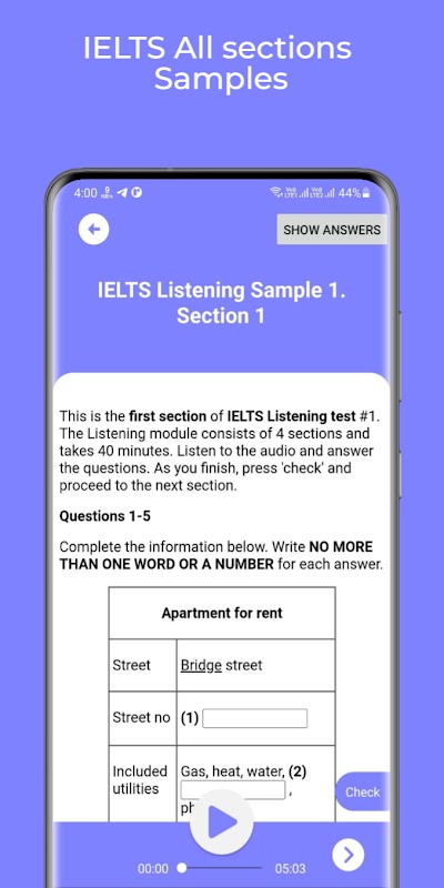 Ujian Amalan: Akses pelbagai ujian yang meniru peperiksaan IELTS sebenar, membantu anda membiasakan diri dengan format dan tahap kesukarannya.