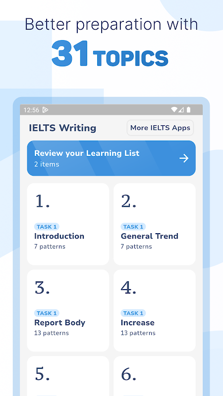 Capai markah yang lebih tinggi pada ujian Penulisan IELTS dengan Corak Penulisan IELTS. Aplikasi ini direka bentuk untuk membantu anda menguasai 31 topik penulisan penting, menjadikan esei anda lebih koheren dan canggih.