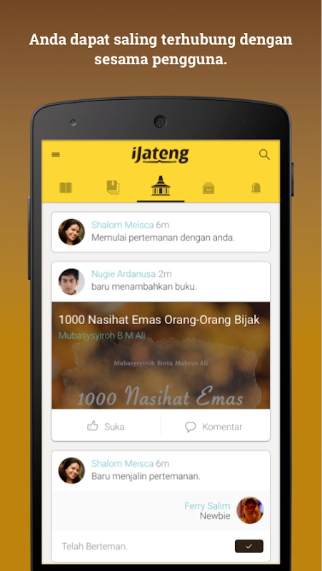 - Feed : Untuk melihat semua aktifitas pengguna iJateng seperti informasi buku terbaru, buku yang dipinjam pengguna lain dan beragam aktifitas lainnya.