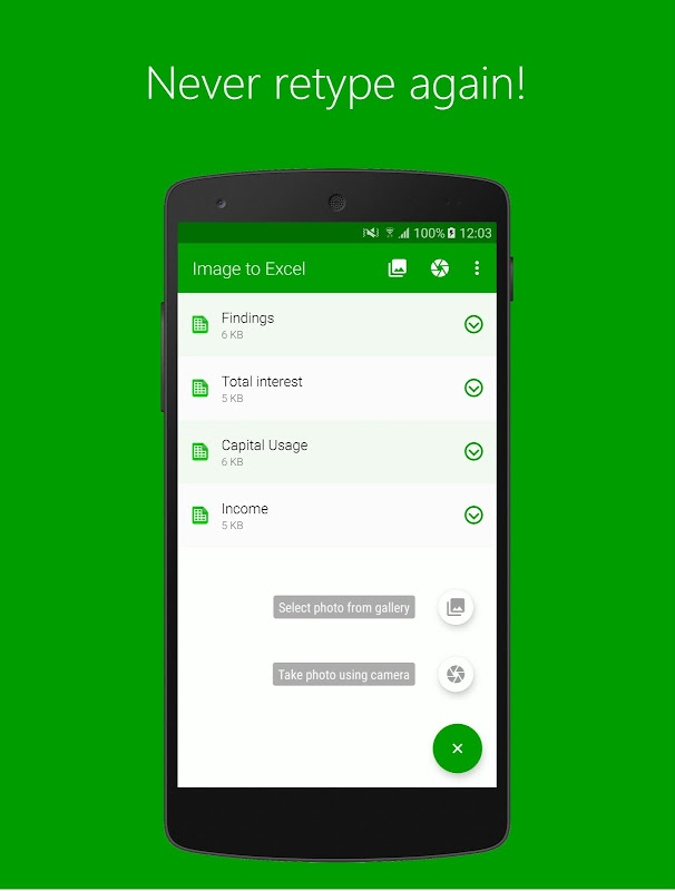 Cara paling mudah untuk mengekstrak data dari imej jadual, laporan, invois, resit dan menukarnya ke hamparan Excel. Tidak perlu lagi taip semula. Hanya tambah imej atau snap foto dokumen kertas anda dan ekstrak data terus ke spreadsheet Excel. Penukaran OCR yang terkemuka di industri akan menukar foto ke hamparan boleh diedit.