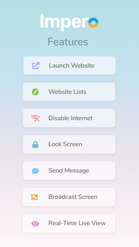 Membolehkan peranti Android menyambung ke penyelesaian pengurusan kelas berasaskan awan Impero yang menyokong semua sistem operasi utama. Membolehkan guru menyampaikan pembelajaran digital di mana sahaja, di mana-mana peranti.