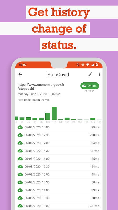 - paparkan status pelayan anda: dalam talian, tamat masa, luar talian, dalam kesilapan.