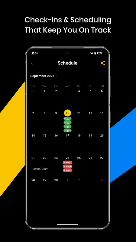 Lupakan hamparan yang tidak kemas atau log senaman yang hilang. Satu ketikan untuk mendaftar masuk, dan kemajuan anda disimpan—supaya anda boleh melihat ke belakang dan meraikan sejauh mana anda telah pergi. Kalendar apl membentangkan kelas berjadual dan sejarah daftar masuk anda dengan jelas dan ringkas, menjadikannya mudah untuk mematuhi rutin anda (tidak lagi panik "adakah saya terlepas senaman?").
