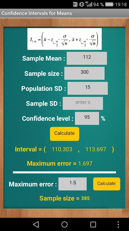 Membolehkan pengiraan bagi taburan normal, mencari selang keyakinan bagi min populasi, bahagian dan untuk mendapatkan saiz sampel dan tahap keyakinan yang ralat diberikan maksimum yang dibenarkan.