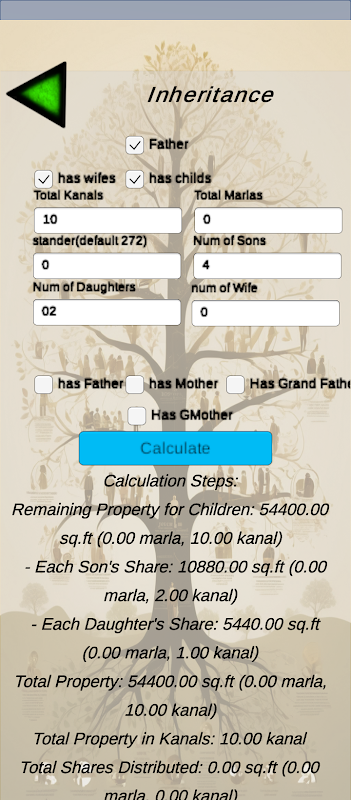 Di tengah-tengah apl ialah Kalkulator Pusaka Islam, yang membolehkan anda memasukkan waris—seperti anak lelaki, anak perempuan, pasangan dan ibu bapa—dan mengira bahagian sah setiap orang secara automatik. Ia mengendalikan pelbagai jenis struktur keluarga, termasuk berbilang pasangan dan kes khas. Pengiraan adalah berdasarkan perundangan Islam yang tulen, dan kemas kini masa hadapan bertujuan untuk menyokong kedua-dua mazhab Sunni dan Syiah.