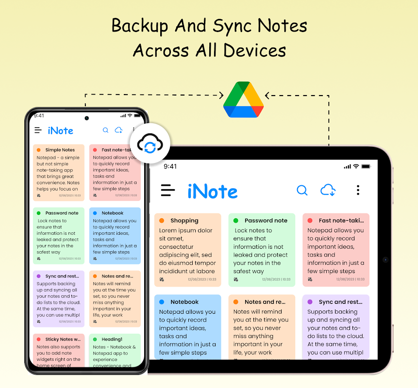 Apl Buku Nota & Nota boleh menyandarkan dan menyegerakkan nota melalui akaun Google Drive anda. Tidak perlu risau tentang kehilangan nota dan buku nota anda.