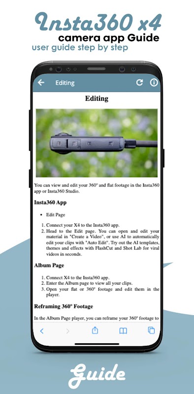 Nota: Apl mudah alih ini adalah panduan untuk kem tindakan insta360 x4. Ia bukan aplikasi rasmi. Ia ialah aplikasi pendidikan yang menyediakan maklumat daripada pelbagai sumber yang dipercayai untuk membantu anda memahami kamera tindakan insta360 x4.