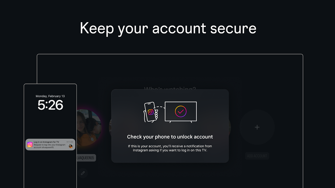 Log masuk dengan akaun Instagram anda. Anda boleh menambah sehingga lima akaun supaya semua orang di rumah anda boleh menonton. Jika anda mahu, anda boleh membuat akaun baharu hanya untuk TV.