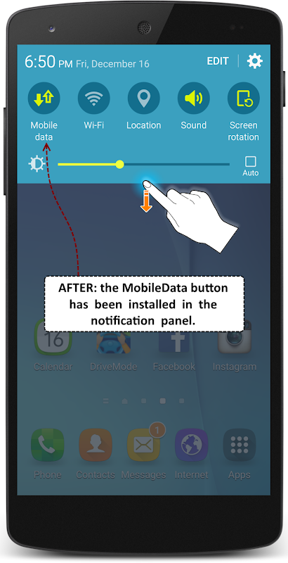 Dengan aplikasi ini (QuickPanel Restore) icon MobileData akan ditambah kepada panel pemberitahuan itu, membuat ia sangat mudah untuk anda untuk melumpuhkan / membolehkan semula sambungan data mudah alih anda (3G, 4G, ...) setiap kali anda mahu.