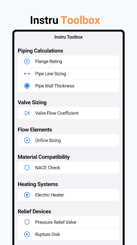 Instru Toolbox ialah apl kejuruteraan yang berkuasa dan mudah digunakan yang direka untuk jurutera instrumentasi dan proses. Ia menggabungkan pelbagai jenis kalkulator standard industri ke dalam satu alat mudah alih yang mudah digunakan yang membantu anda melakukan pengiraan yang rumit dengan mudah — terus dari poket anda.