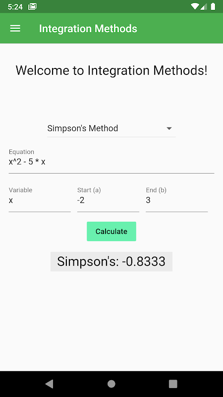 Calculate integrals with the Simpson's Method, Trapezoidal Method, and Midpoint Method, and learn about these methods. Integration methods is an app designed to learn about numeric methods and compare their accuracy.