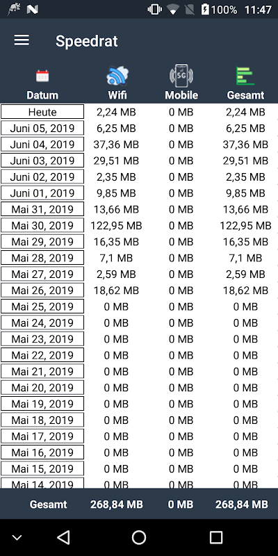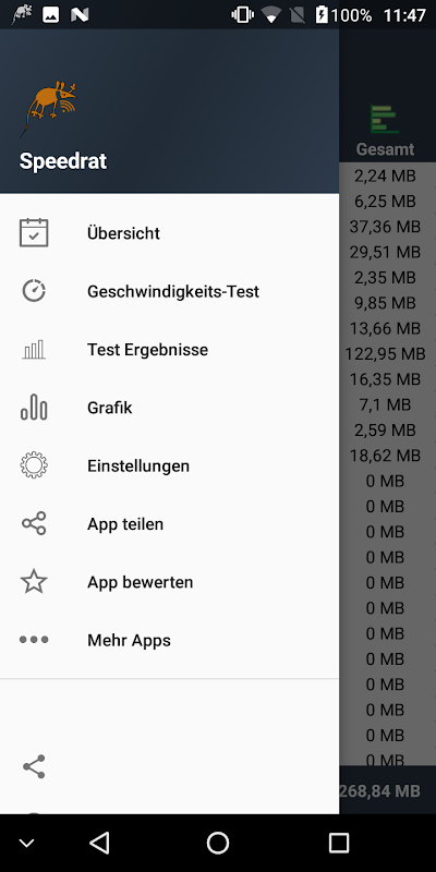 Alat percuma kecil untuk mengukur Wi-Fi semasa dan kelajuan mudah alih. Pilihan ujian melalui nilai ping dan muat turun / kelajuan muat naik. Kemungkinan paparan tetap dalam pemberitahuan. Gambaran keseluruhan penggunaan data pada hari atau bulan terakhir, dibahagikan kepada WLAN dan mudah alih. Berdasarkan data, mis. kontrak sedia ada dengan penyedia perkhidmatan mudah alih diselaraskan dan dikawal. Mengawal jumlah data yang anda makan pada siang hari.