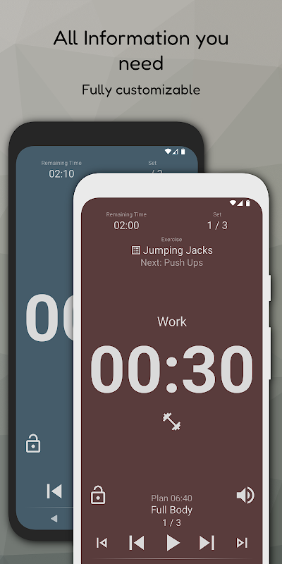 Buat senaman dengan memanaskan badan, masa persediaan dan senaman, serta rehat dan set atau ulangan. Konfigurasikan isyarat yang berbeza (bunyi / getaran) dan pembantu suara. Tambahkan nota, gambar dan video pada latihan. Paparan pemasa yang besar dan boleh dikonfigurasikan secara individu. Tunjukkan status latihan sebagai pemberitahuan apabila pemasa berjalan di latar belakang.