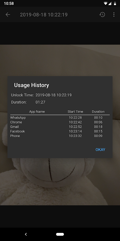 • IntruderCheck menyimpan 10 acara buka kunci terkini. Tiada batasan sekiranya anda menaik taraf ke mod PRO.